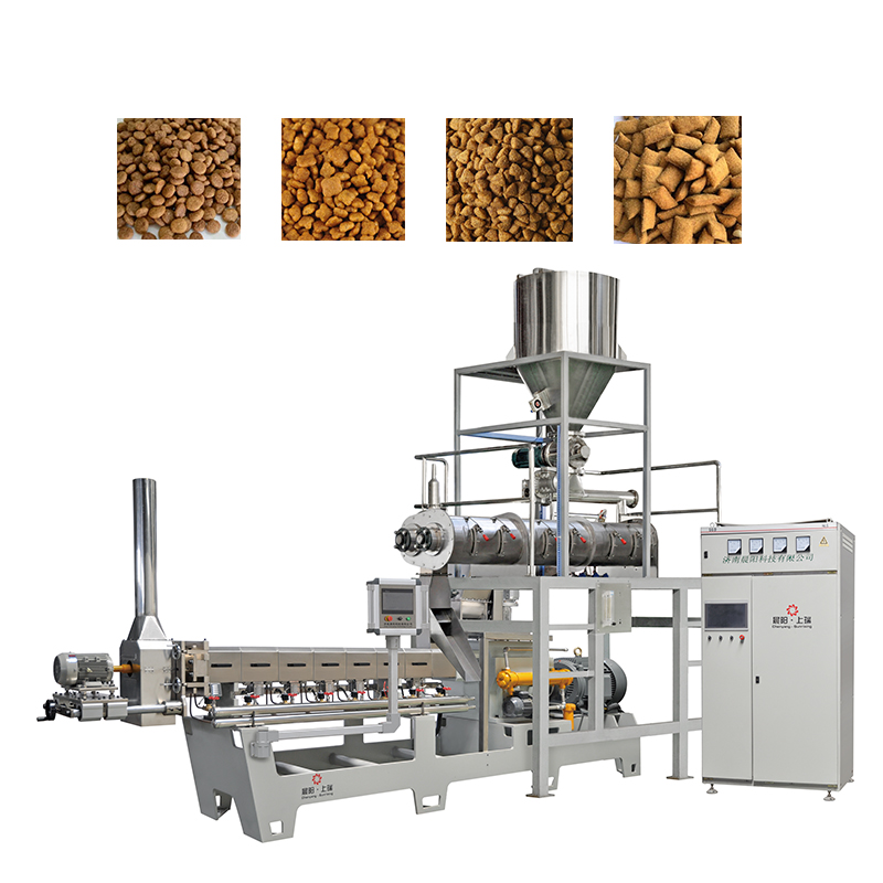擠壓膨化:核心設備是雙螺桿擠壓膨化機,通過高溫高壓環(huán)境將混合好的原料進行膨化,形成酥脆的狗糧。這一步驟負責將混合好的原料經(jīng)過高溫高壓處理,形成的質地和口感