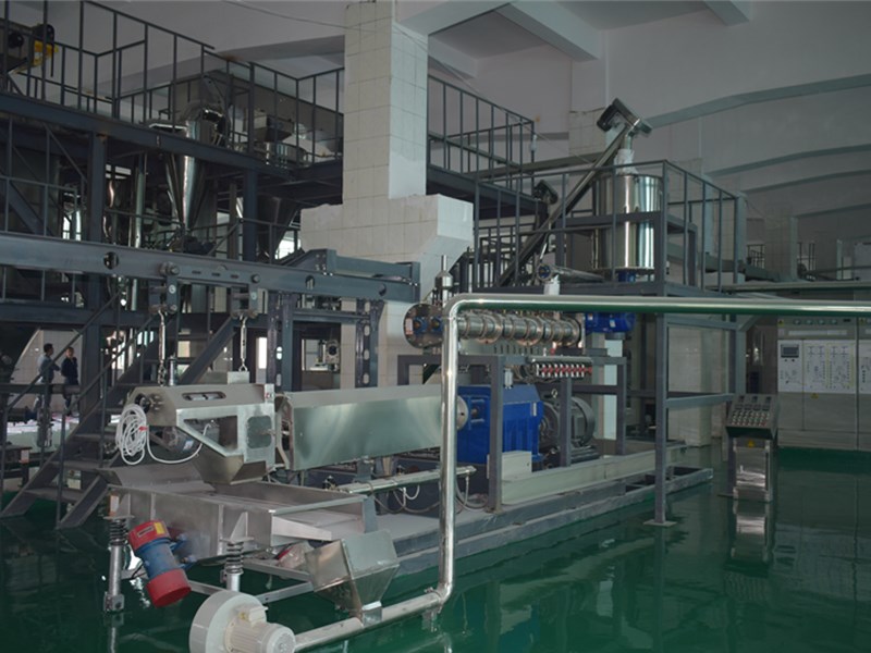 拌粉機→螺旋提料機→膨化主機→振動篩→風送機→壓片機→風送機→冷卻攤料機→五層烘箱→提升機→震動攤料機→高溫烘干機→提升機→單滾筒噴涂線→烘箱→冷卻輸送機
