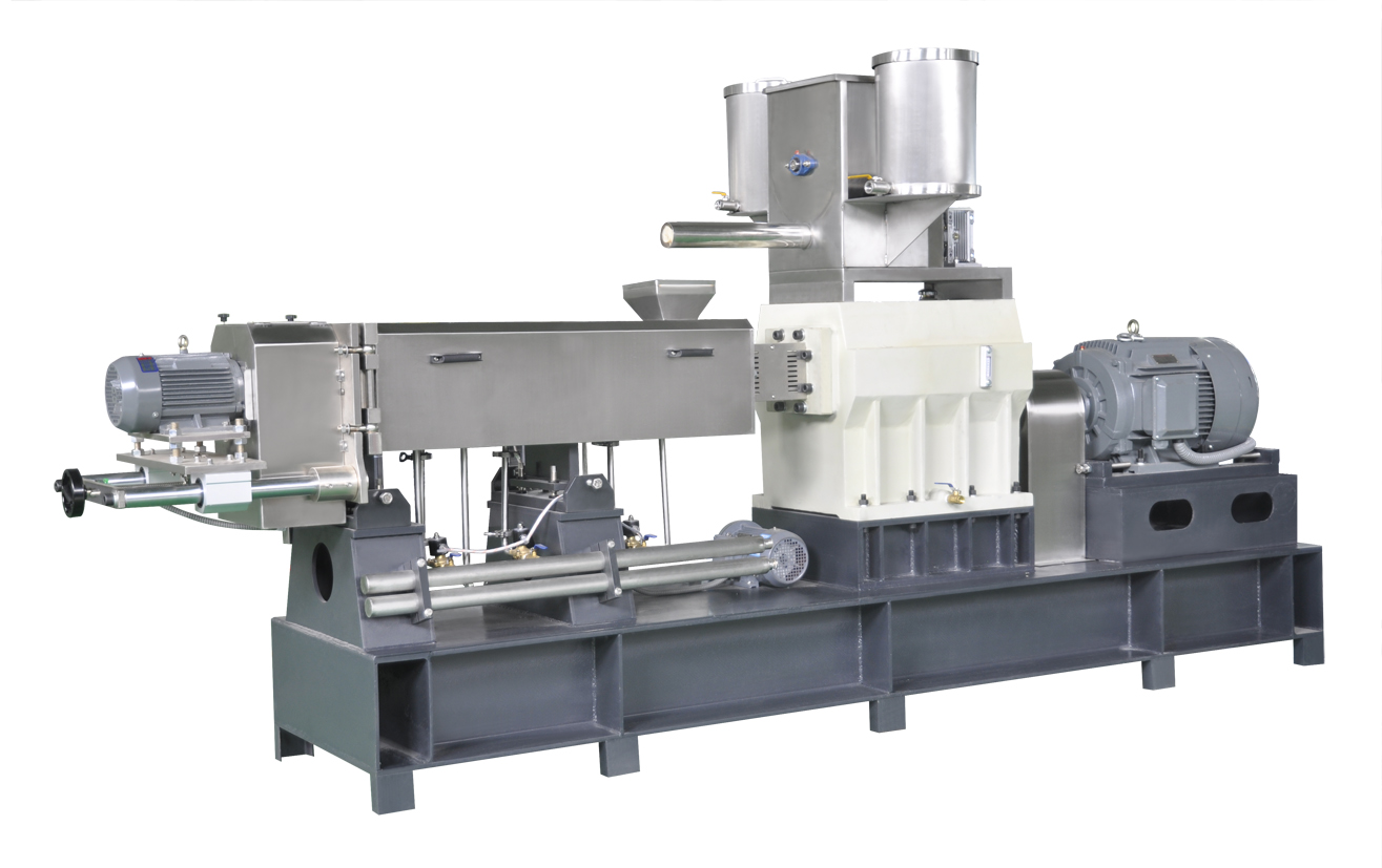 2、雙螺桿膨化機:混合的原料在高溫高壓環(huán)境及雙螺桿的擠壓情況下,原材料中的淀粉結(jié)構(gòu)發(fā)生變化,變成容易吸收的營養(yǎng)成分,通過模具擠出。雙螺桿膨化機采用先進的變頻調(diào)速技術(shù),更節(jié)能,速度控制更精確,電機運行中電流、轉(zhuǎn)速都可以通過變頻器面板直接觀看,確保設(shè)備安全。