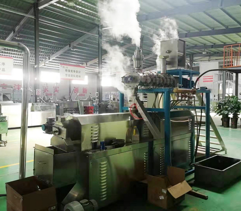 拌粉機(jī)→螺旋上料機(jī)→(調(diào)制)雙螺桿膨化機(jī)→風(fēng)送機(jī)→多層烘干機(jī)-滾筒調(diào)味機(jī)