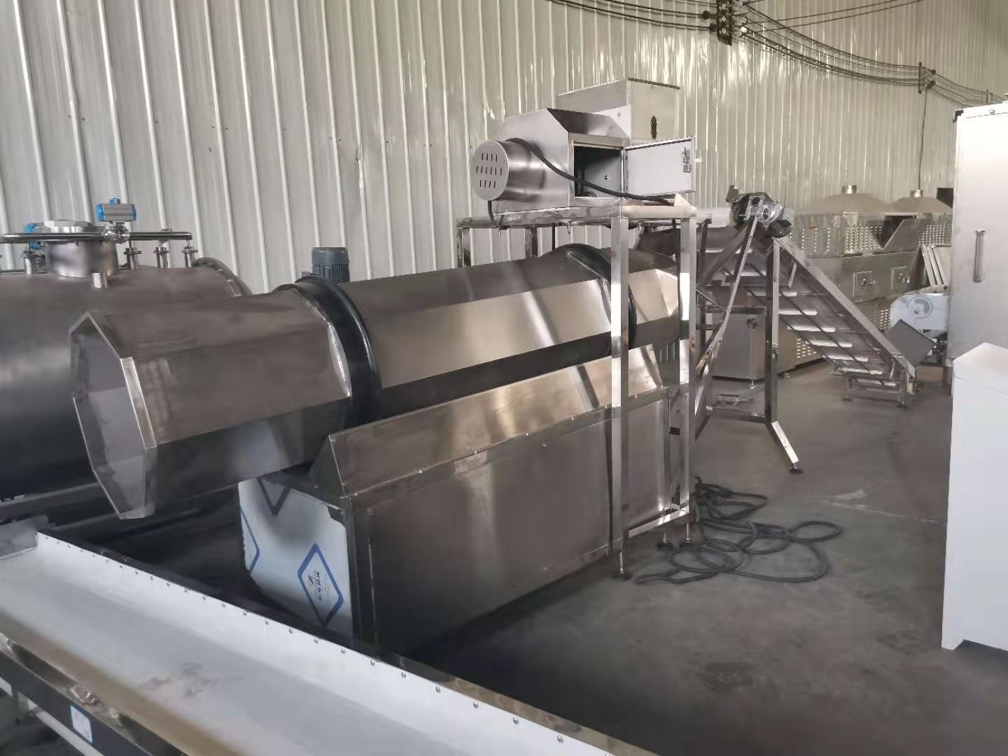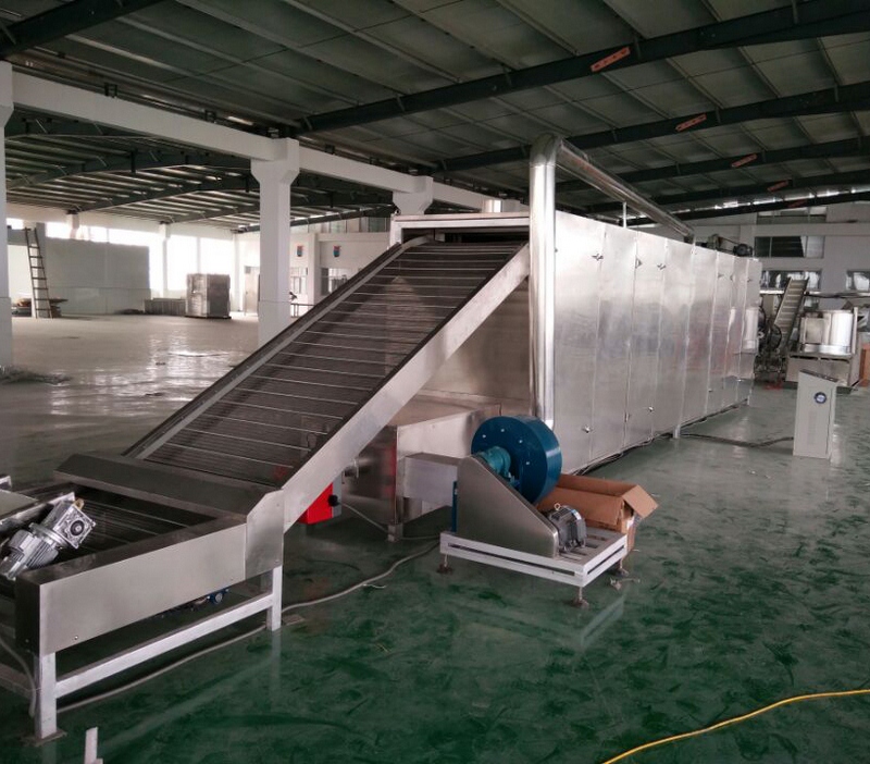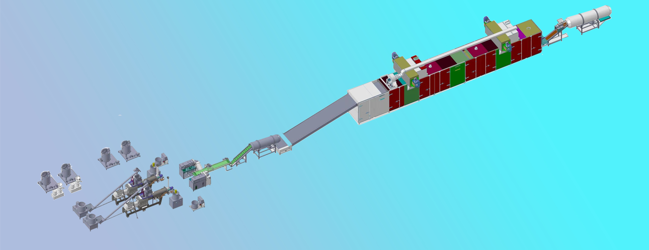 拌粉機(jī)→螺旋上料機(jī)→雙螺桿膨化機(jī)→夾心機(jī)-整形切斷機(jī)→提升機(jī)→六米五層烘干機(jī)-雙筒調(diào)味機(jī)