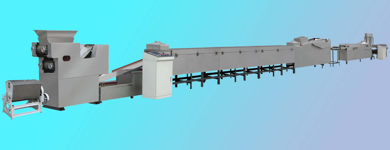 和面機(jī)→壓面機(jī)→蒸煮切斷機(jī)→油炸機(jī)→冷卻機(jī)