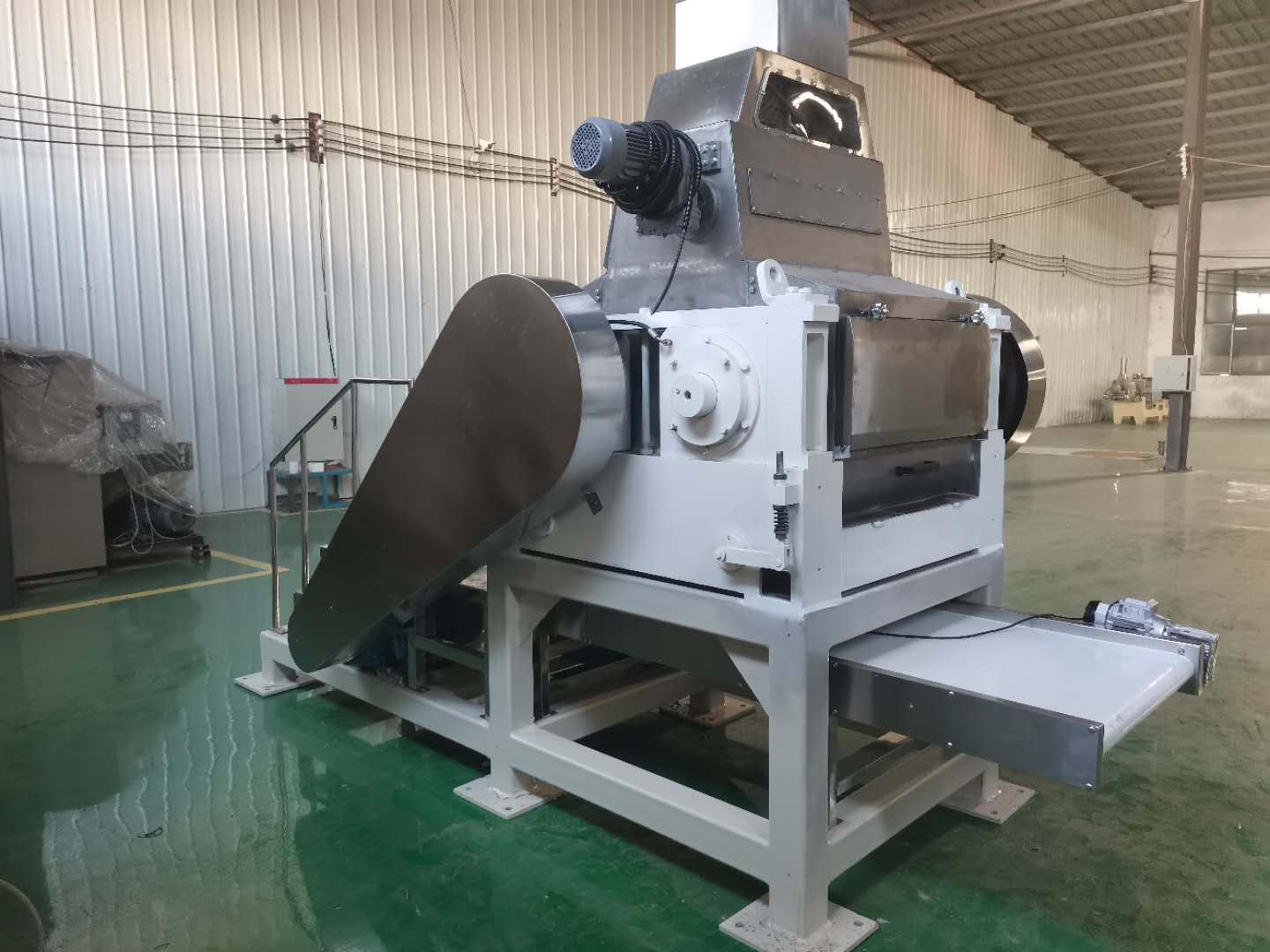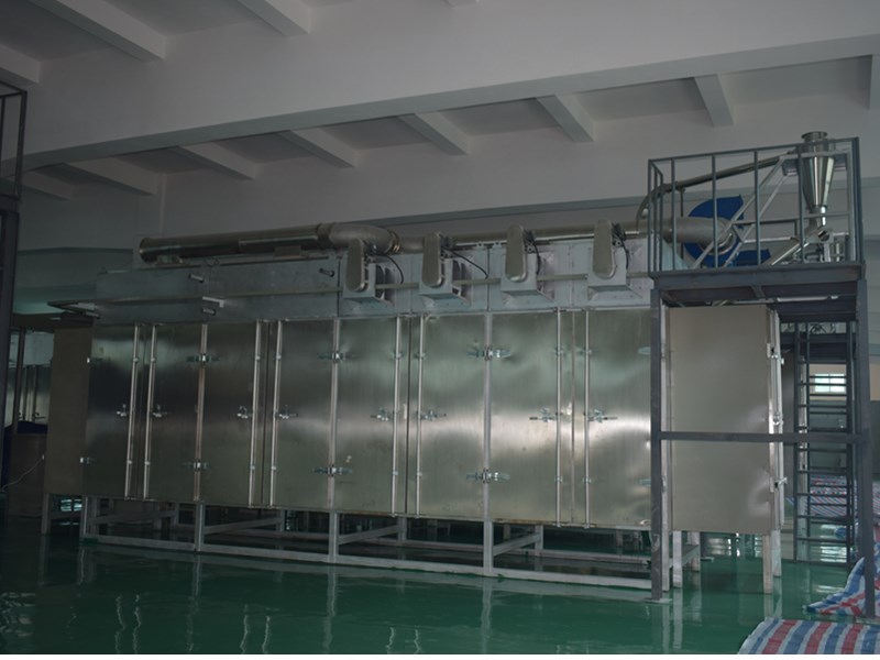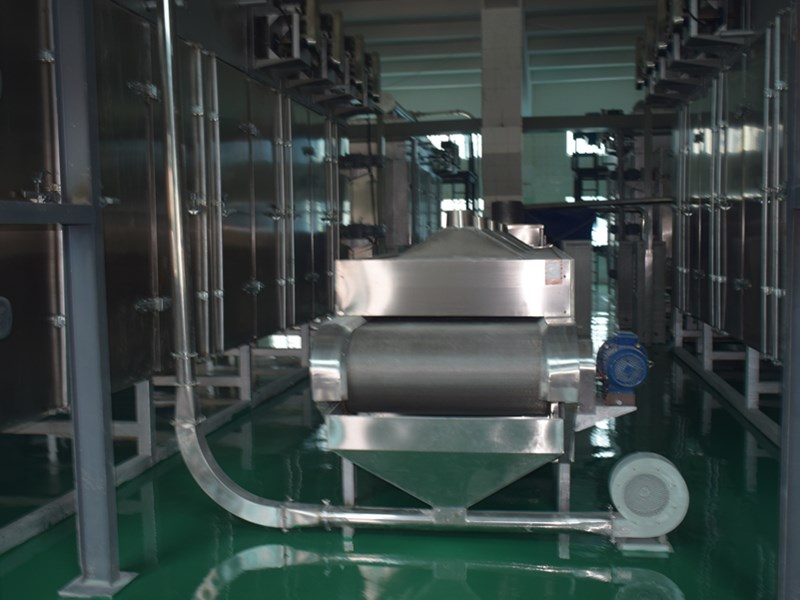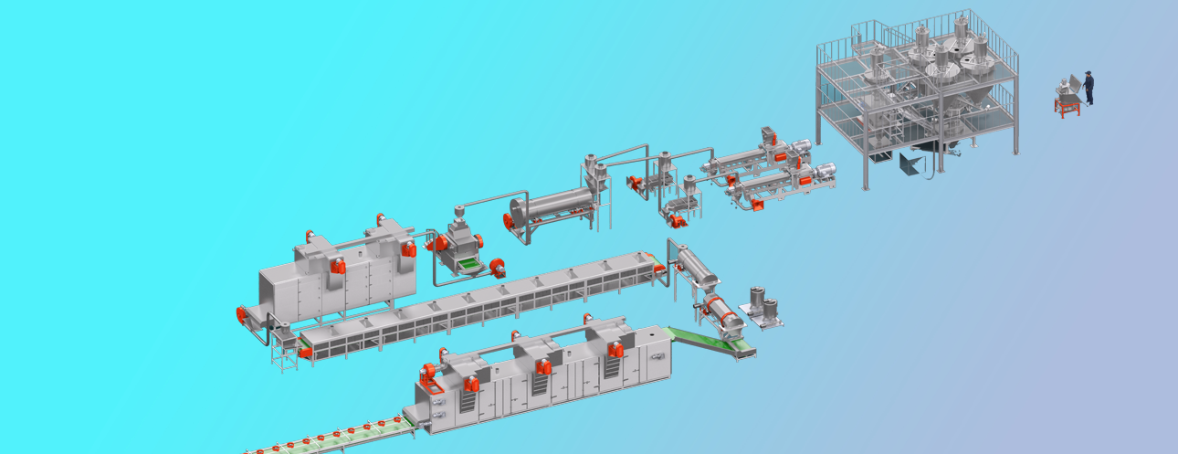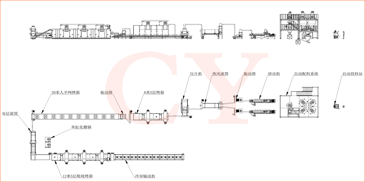拌粉機→螺旋提料機→膨化主機→振動篩→風送機→壓片機→風送機→冷卻攤料機→五層烘箱→提升機→震動攤料機→高溫烘干機→提升機→單滾筒噴涂線→烘箱→冷卻輸送機